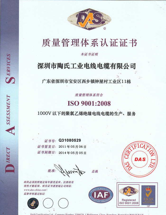 陶氏工業電線電纜有限公司自成立到現在榮獲多種證書
